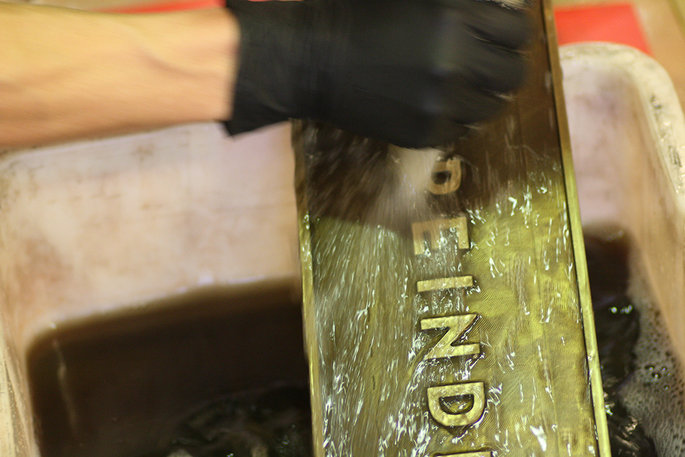 Derfor fræsede vi nogle fine skilte i messing, brunerede og patinerede dem, så de fik et udseende der passer til virksomhedens identitet og særlige stemning.